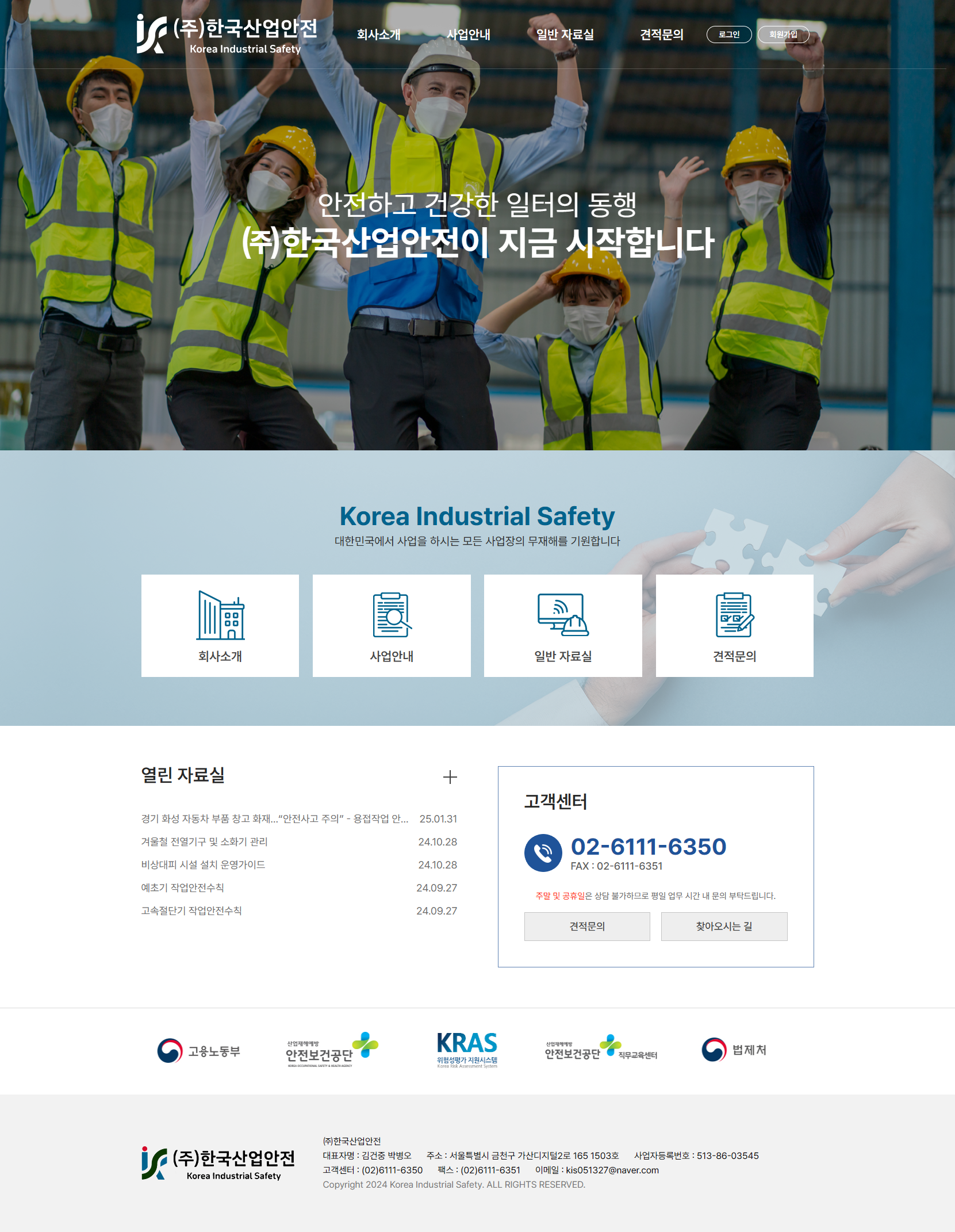 저희 ㈜한국산업안전은 근로자의 생명과 안전을 지키는 소임을 가지고 고용노동부의 믿음과 신뢰를 바탕으로 설립된 안전관리전문기관입니다
