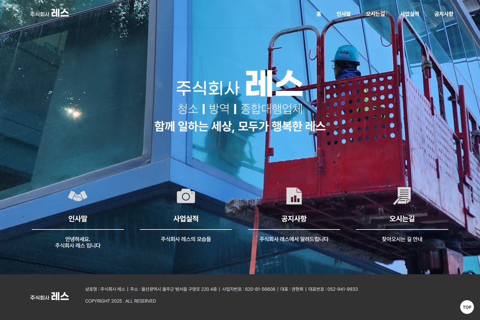"일상의 안전과 깨끗함을 책임지는 기업, 모두가 행복한 일터를 꿈꾸는 동반자", 주식회사 레스와 함께하세요.