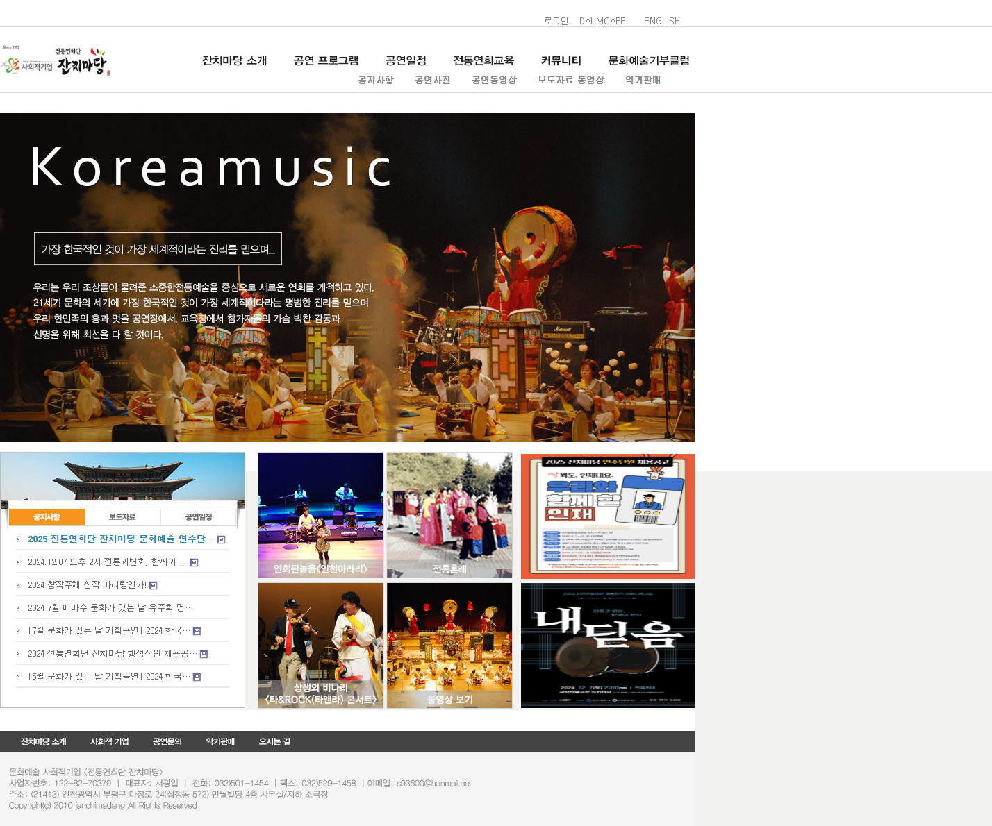 목록 본문 전통연희단 잔치마당 1 상세정보 전통연희단 잔치마당 주소 인천 부평구 마장로 24 4층 대표번호 032-501-1454 플레이스 서비스 홈페이지 http://janchimadang.com/ 이전글소나무 영어학원 만촌관 25.05.02 다음글참 디자인 25.05.02