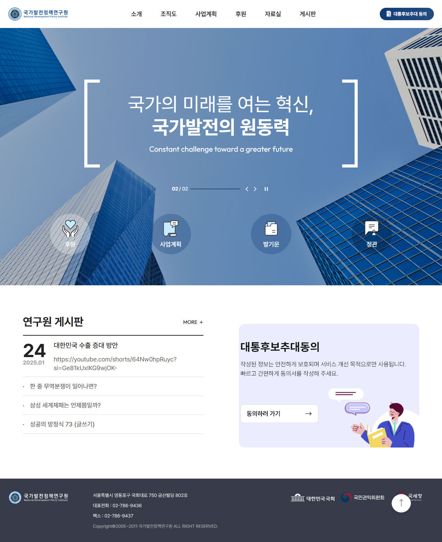 위기는 곧 새로운 기회입니다. 우리에게 필요한 것은 변화를 두려워하지 않는 도전 정신, 그리고 미래를 준비하는 지혜입니다. 국가발전정책연구원은 국민과 함께 더 나은 미래를 설계하는 데 앞장서겠습니다.